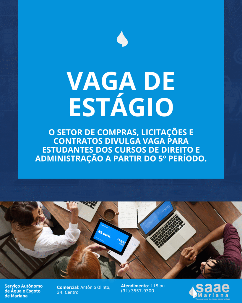 SAAE Mariana divulga vaga de estágio para setor de compras, licitações e contratos